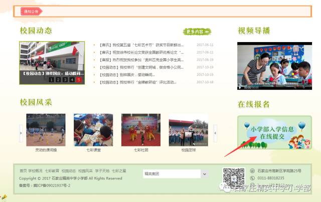4、进入“石家庄精英中学小学部”网站页面,点击“小学部入学信息在线提交”,进入“在线报名”,点击报名。