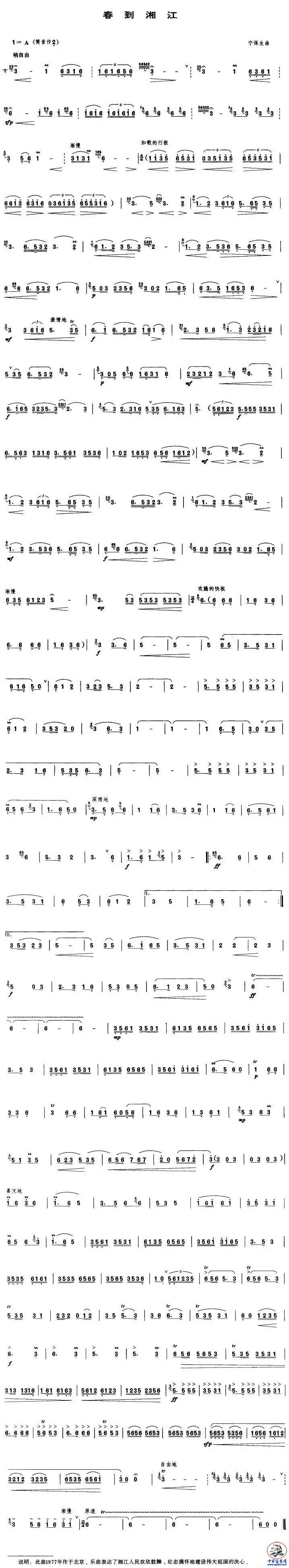 《春到湘江》是宁保生先生1976年创作的竹笛名曲自问世以来,就以其鲜明的湖南花鼓音乐特色,时而激情如火,时而流畅清雅的旋律,引起了全国广大笛子演奏者的热烈反响,并受到了笛子爱好者的特殊青睐。