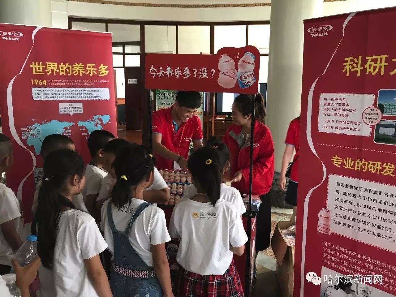 养乐多(中国)投资有限公司哈尔滨分公司来到现场,给孩子们免费发送冰镇饮料避暑降温。