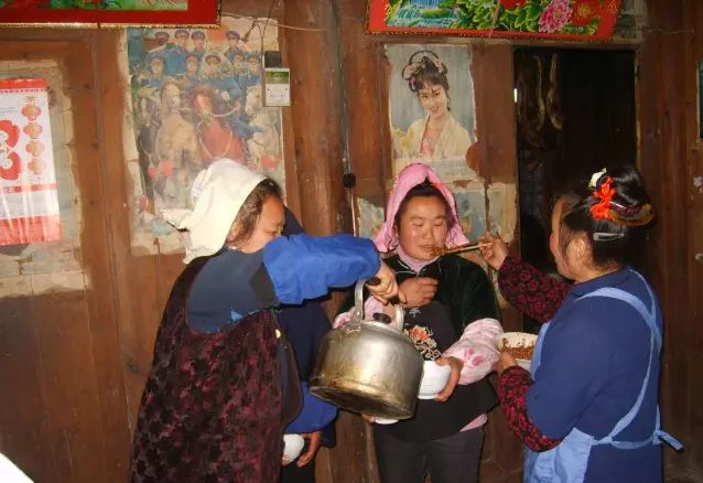 主人把事先早已准备好的包谷烧酒,请来寨子里德高望重的族老和歌师,在自家的大门口摆下大方桌,桌子上摆满了一碗碗喷着清香的美酒。客人来时,由主管把门的族老首先唱讲贺词,然后,客人中最年长且声望高的长者唱答谢词。
