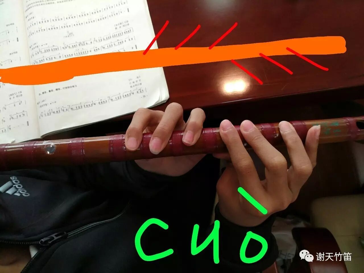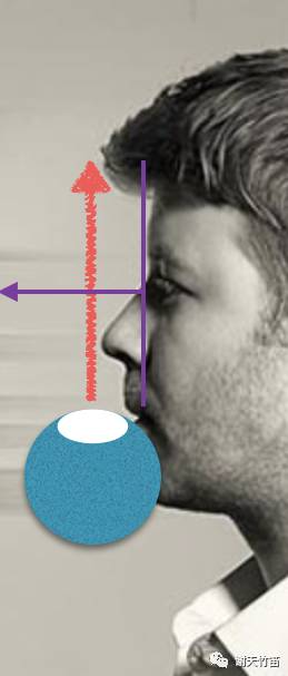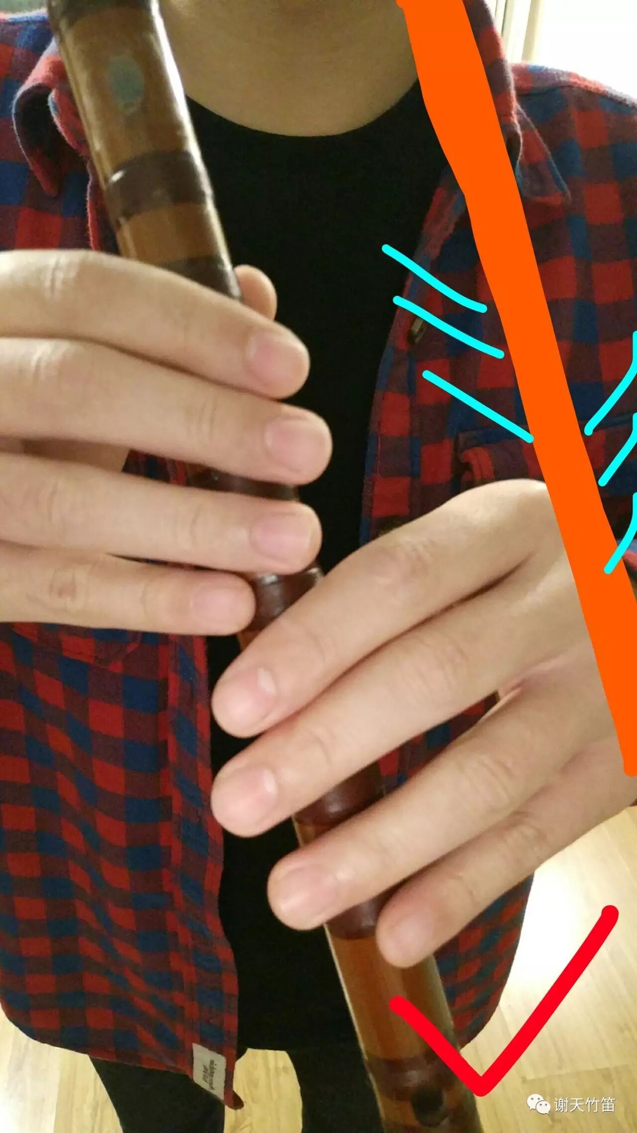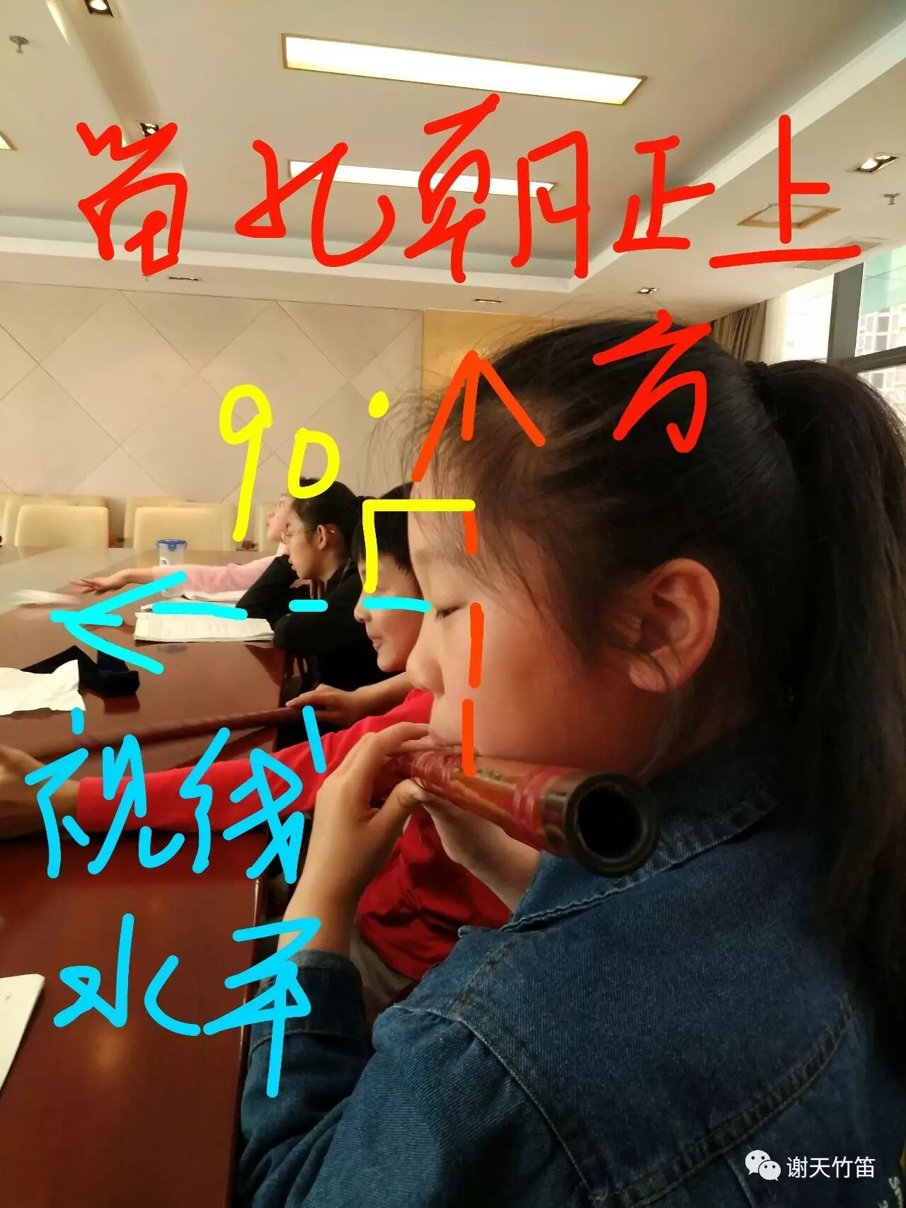 2、下面这个要求要注意了!初学笛子80%以上的同学会犯的错误!笛子角度与面部或者说水平视线的关系接近垂直关系。正确的姿势是:笛孔朝正上方,面部向前,二者角度接近90度。嘴唇压住吹孔的1/4。
