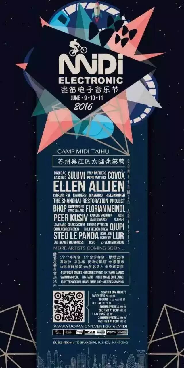 2016迷笛电子音乐节将于6月9日-11日在苏州市吴江区七都镇太湖迷笛营举办。4个户外舞台,4个室内舞台。选择在世界电子音乐界具有重大贡献的国际艺人,以及100多名中外电子艺人,带来一场集电子音乐、极限运动、水上运动、露天泳池、游乐场、露天影院、创意集市、中外美食等多元素融合的夏季狂欢派对!