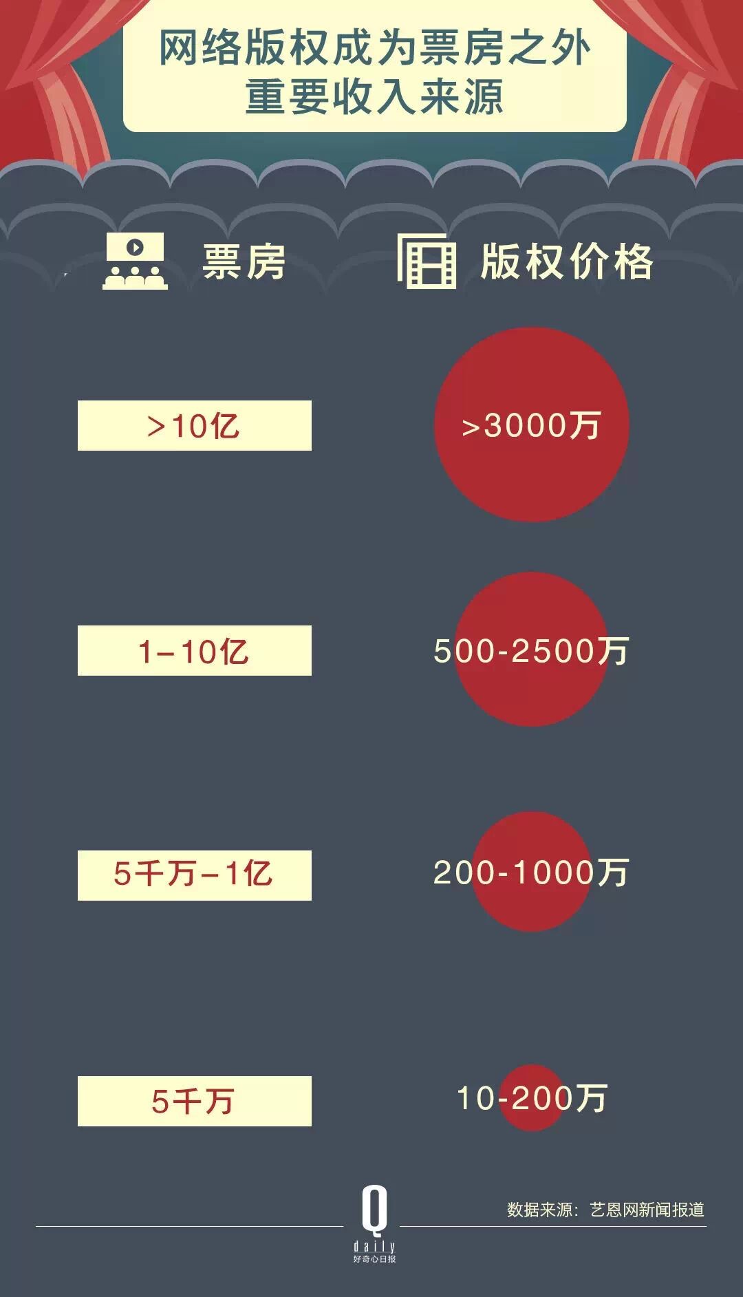 今年贺岁当的大片《天将雄狮》的独家数字版权就以 3000 万的价格卖给了华视网聚传媒科技有限公司。《一步之遥》的网络播放版权据说也卖到了 3000 万。华视网聚高级副总裁张明就透露票房预估超 10 亿的电影,版权价格突破 3000 万;票房过亿但不超过 10 亿的电影,版权价格在 500 万到 2500 万不等;票房 5000 万以上到 1 亿的电影,价格在 200-1000万之间;不足 5000 万的,从几十到 200 万不等。
