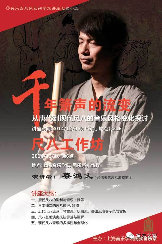 【笛友之家讯】:(记者 刘墨)上海音乐学院专题讲座《千年箫声的流变---从唐代到现代尺八的音乐风格变化探讨》将举办两场活动,分别于2014年12月9日 晚上6点, 在上海音乐学院北216室和2014年12月10日 晚上6点在上海音乐学院民乐系排练厅各举行一场,欢迎大家的光临。