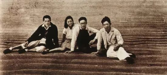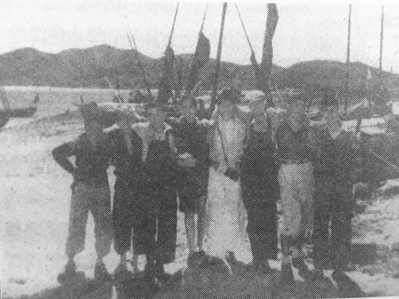 图 1934年夏,聂耳与影片《渔光曲》的主创人员在象山县石浦海滩合影(左四为聂耳、左三蔡楚生,左一罗朋、