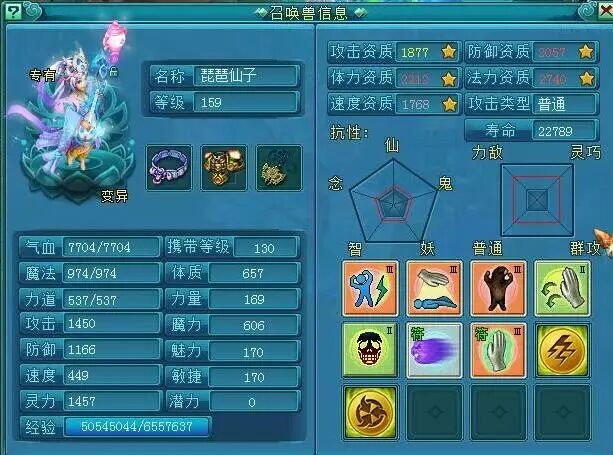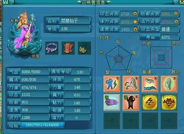 最后,给大家带来的是一只四技能的琵琶仙子,虽然技能数不及上述的多,但2773法资的他也丝毫不逊色与上者,而擅法+厄运内丹的配搭也使他能够在这个幸运必备的年代据有一席之地,另外值得一提的是1459的低速资也能够在PK中守尸体的战略中起到不错的作用。