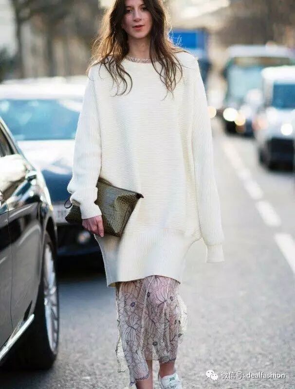 白色长毛衣底下露出一层薄如蝉翼的蕾丝裙,裸色和蓝色花纹点缀,看起来正好是温柔的春天。