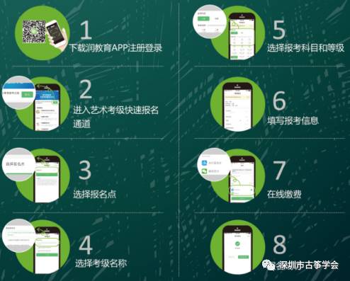 考生/家长/指导老师报名流程:下载润·教育App(用户版)-从“艺术考级”栏目点击快速报名通道入口进入-选择报名点(指定报名点机构学员请选择所在机构报考,其他学员请选择深圳市古筝学会报考)-选择考级-选择报考科目和级别(同一考生仅支持单科目报考,连报的考生可同时选相邻两级别)-填写报名信息-在线缴费-报考完成。润·教育App支持多个考生同时报考,报名成功后继续添加考生即可。