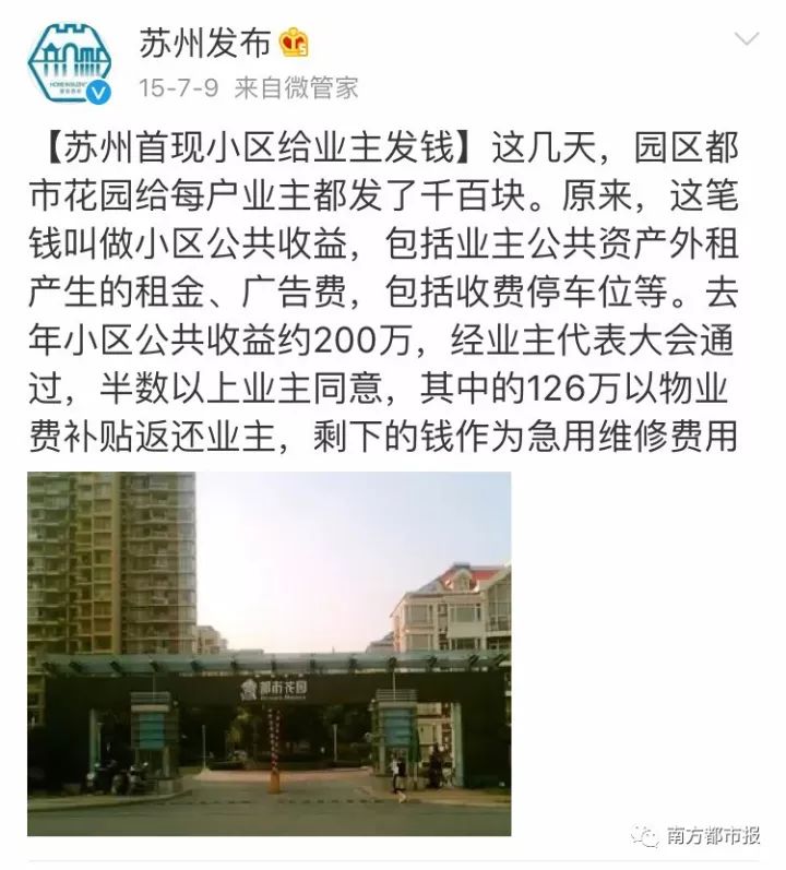 其实,发这“公共收益”红包的,并不止这一家。早在2015年7月份,苏州园区都市花园就将公共收益126万以物业补贴发给了业主。