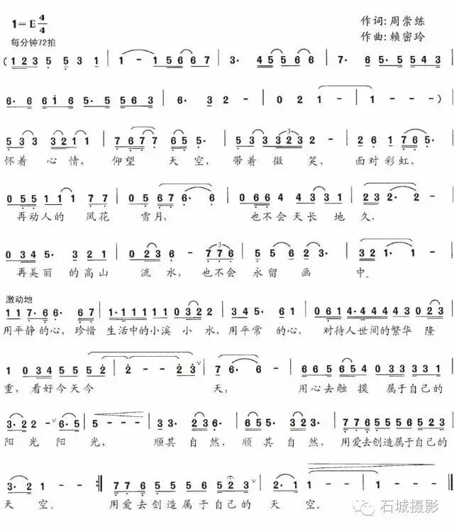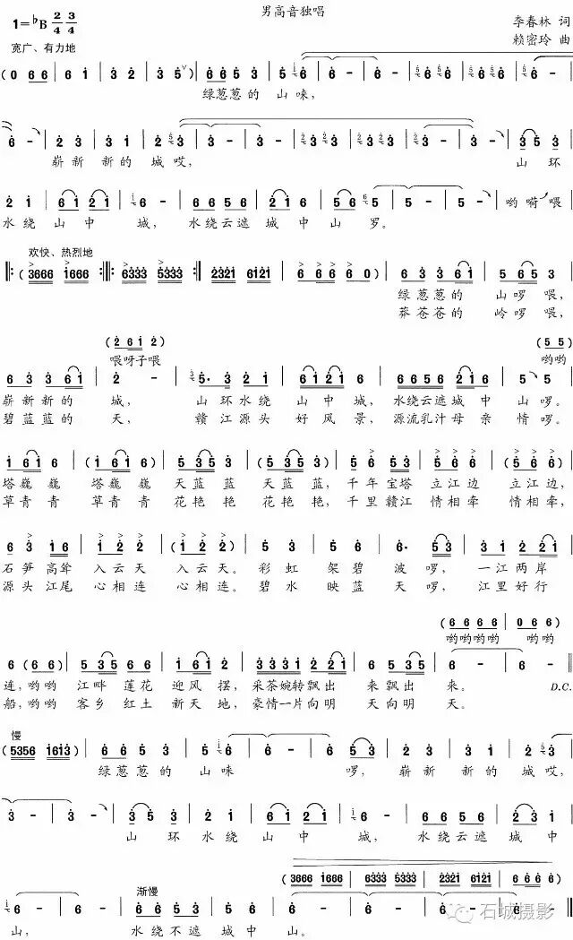 10.石城县歌代表作有《赣江源放歌》、《石城,我可爱的家乡》、《精美的石头会唱歌》,企业歌代表作有《雅泰情》,校歌代表作有《憧憬明天》、《井冈山精神代代传》,大型灯彩音乐代表作有《古城新貌》、《璀璨赣江源》、《舞龙谣》、《辉煌战歌》,结合我县重点工作创作歌曲代表作有《幸福之城》、《山城同创美莲乡》,其他省、市、县的村歌代表作有《人间又一新天堂》、《干窑、千窑》、《我在西塘,你在哪里》等等。