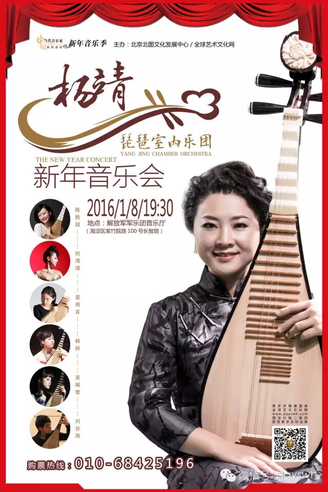 中国当代音乐家系列活动之新年音乐季是由北京北图文化发展中心、全球艺术文化网联合主办,2016年1月正式启动。“杨靖琵琶室内乐团新年音乐会”将于2016年1月8日晚19:30分在解放军军乐厅隆重举办。中国音乐学院教授杨靖和她优秀的学生们将携手为观众奉献一场风格多样、作品多元、质朴感人的音乐盛宴。在曲目的安排上,音乐会既有传统曲目,也有高难度的现代琵琶协奏曲,将带领大家从古典到现代,感受不同时代、不同地域琵琶语言的独特魅力。