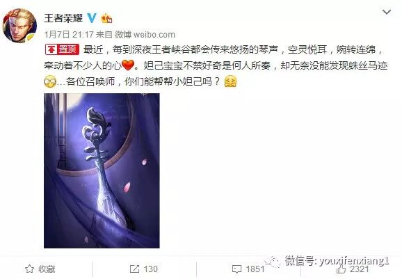 最近,每到深夜王者峡谷都会传来悠扬的琴声,空灵悦耳,婉转连绵,牵动着不少人的心。妲己宝宝不禁好奇是何人所奏,却无奈没能发现蛛丝马迹…各位召唤师,你们能帮帮小妲己吗?