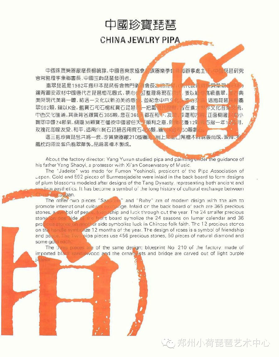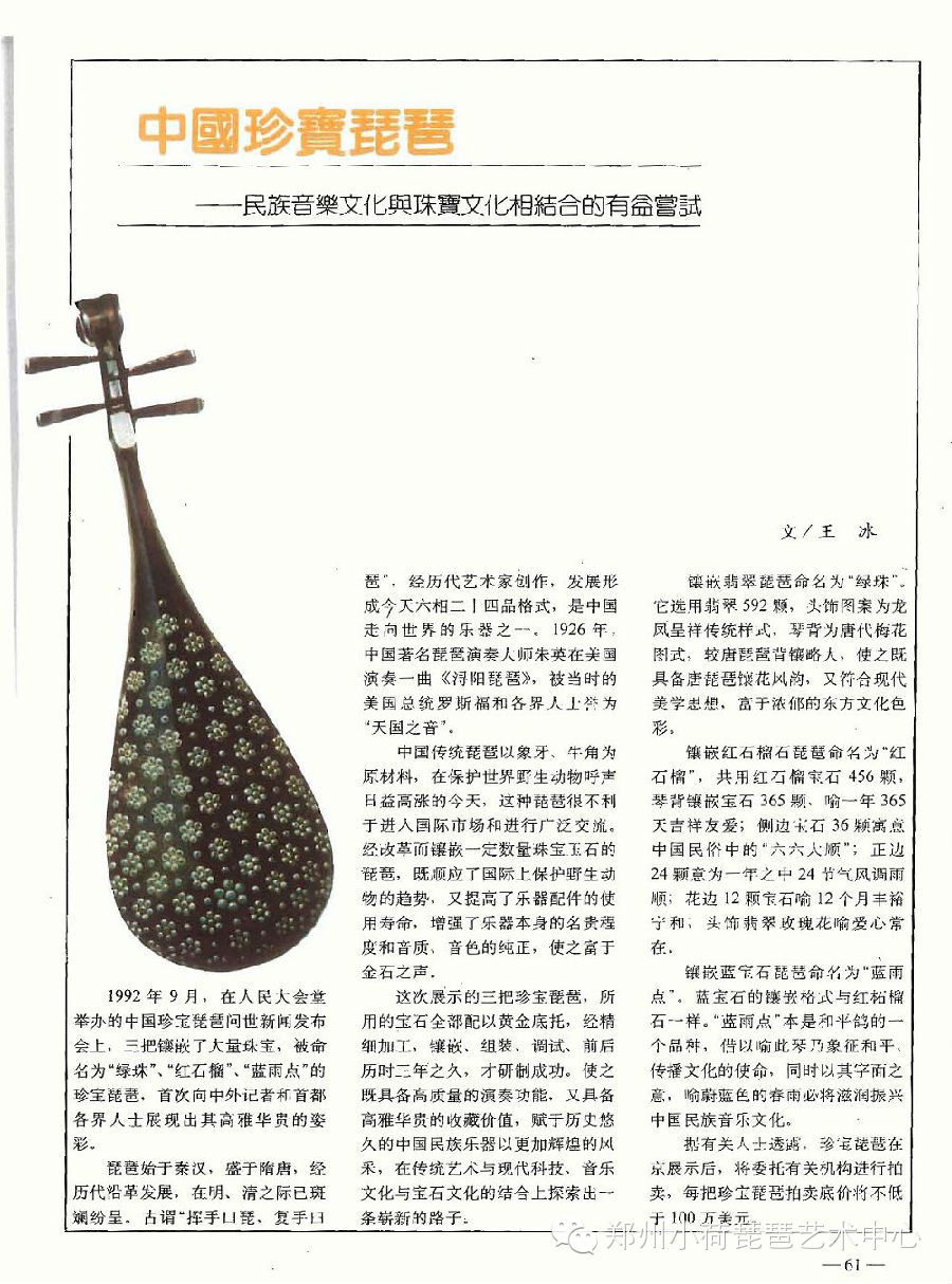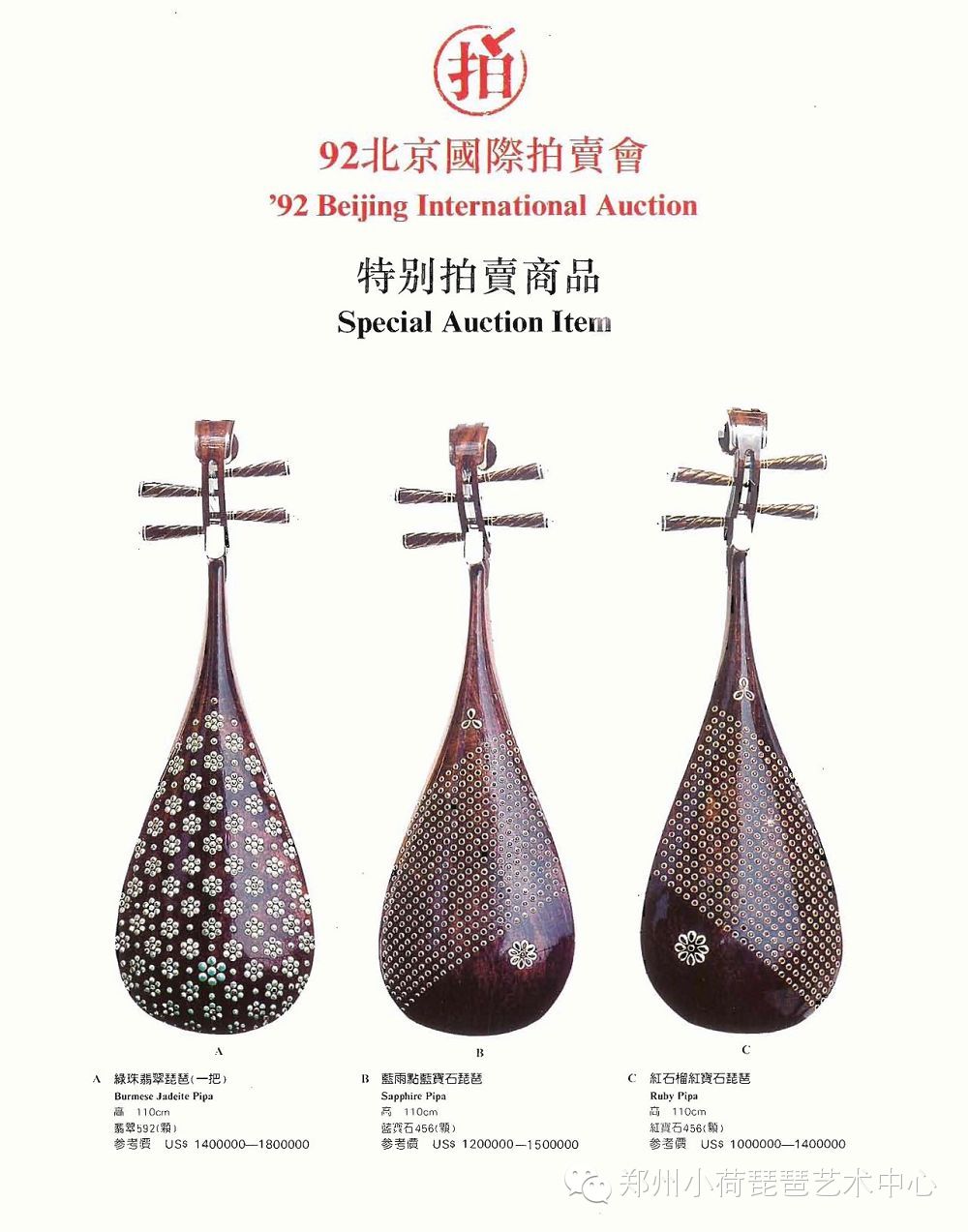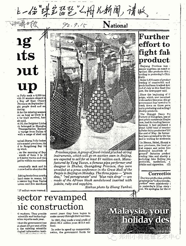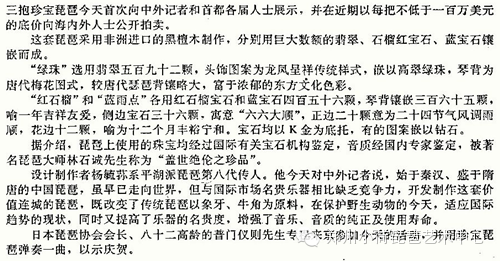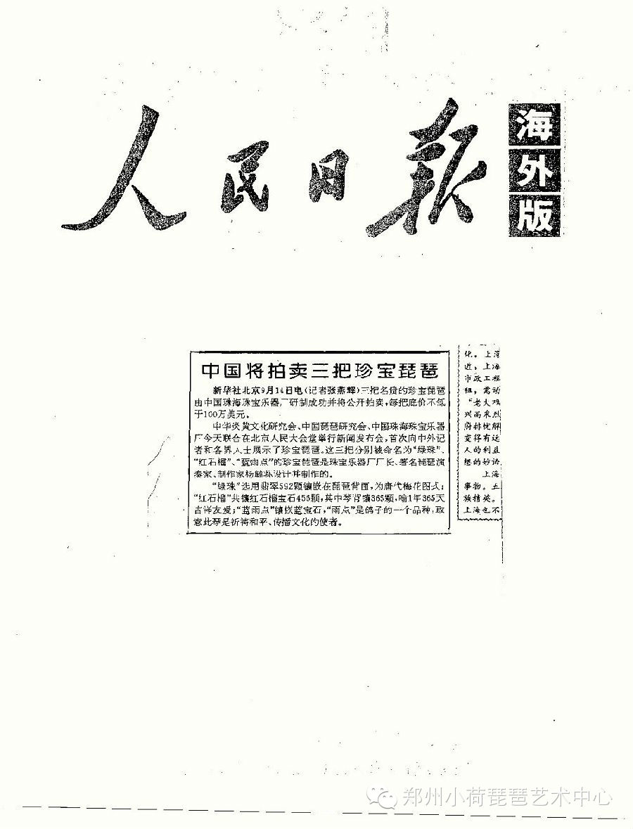 珍宝琵琶由珠海珠宝乐器厂研制,采用非洲进口的黑檀木制作,共有三把,分别用巨大数额的翡翠、石榴红宝石、蓝宝石镶嵌而成,起名为:“绿珠”、“红石榴”、“蓝雨点”,在当年以每把不低于一百万美元的底价向海内外人士公开拍卖。这是当时的报纸刊登的新闻:(点击放大看)