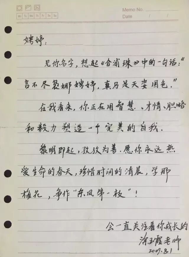涂玉霞校长写给娉婷的鼓励信,她一直珍藏着。