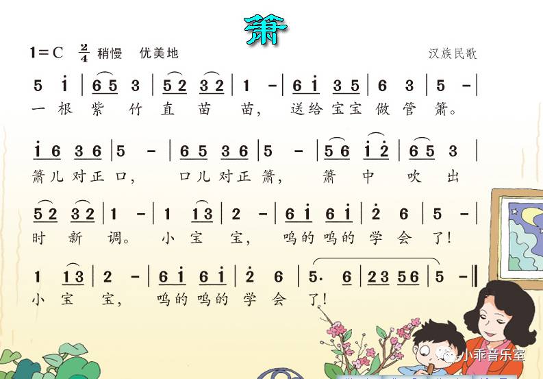 《萧》是一首流行于我国江南地区的民间小调,五声徵调式,旋律优美委婉,表现了母亲看着孩子吹箫时的柔情和爱意,让我们先来欣赏一下。