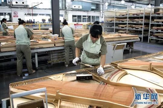 图为宜昌钢琴生产基地的工人在调整弦锤。(图片来自新华网)