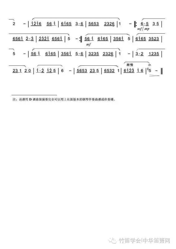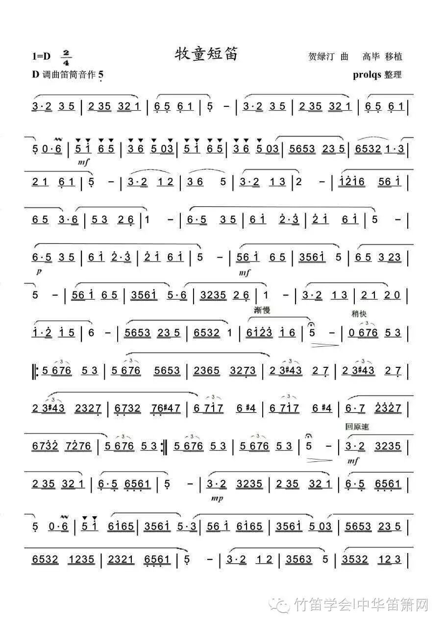 编者按:本曲谱调性与长笛韩国良演奏版一致,可以通用长笛版的伴奏。用A调小梆笛筒音作2,D调曲笛筒音作5来演奏,伴奏可在中华笛箫网下载。曲谱音频由高毕老师授权竹笛学会---中华笛箫网发布,感谢高毕老师和prolqs老师!版权归原作者所有。