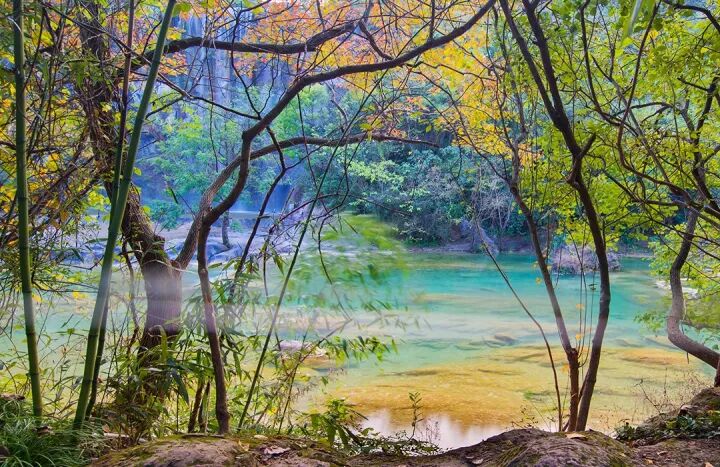 美人谷是水做的童话世界,关于它的美丽已经不用说太多,冬季的美人谷变得色彩斑澜,这时的美人谷正展现它极致的美,红色,黄色的叶子与蓝色,绿色的溪水交织在一起,加上瀑布的点缀,令人惊叹这里是天上人间。