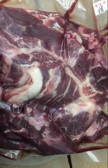 而松弛,有紫色光泽。脂肪呈黄色,干燥而少粘性,肉不易煮烂