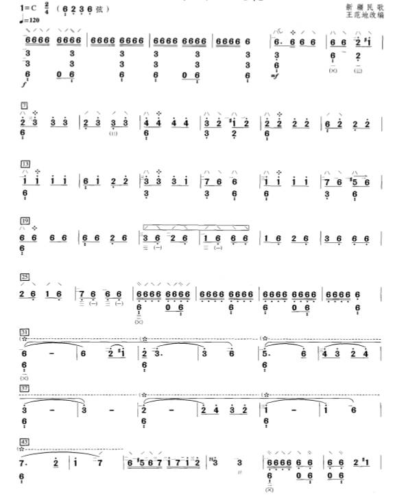 王范地于1961年将这首著名的新疆民歌改编成琵琶独奏曲,通过鲜明多变的舞蹈性节奏及热情奔放的旋律,描绘出一幅沉醉在爱河中的青年男女们热恋时激情而又快乐的画面。演奏时应注意“长轮”及“摇指”段落中歌唱性旋律的处理;全曲具有强烈的舞蹈节奏,强音的安排要处理得宜;末段以左右手轮流拍击琴面来模仿新疆手鼓,节奏要准确而流畅,方能表达出乐曲的风格。