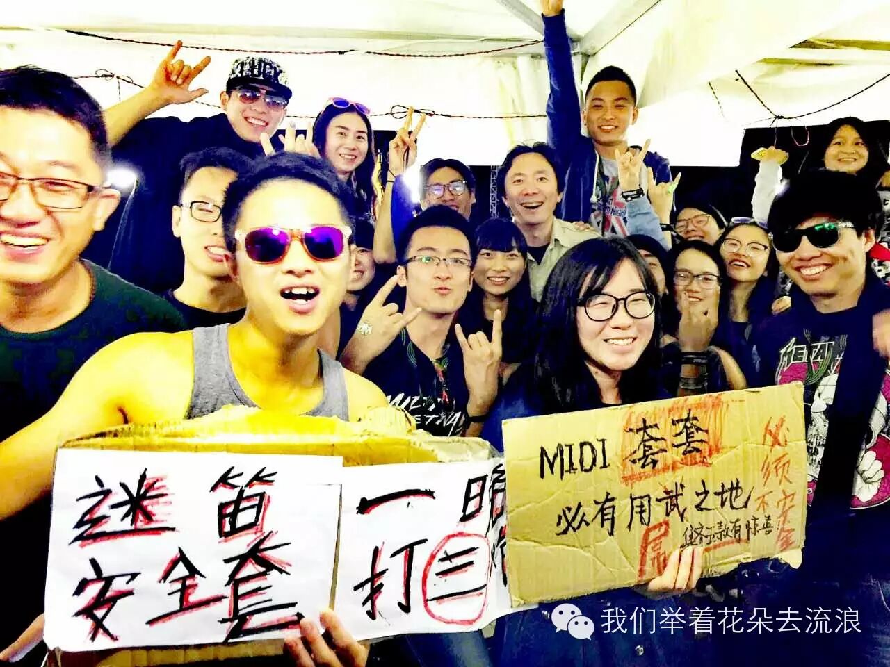 当然,这次也有很嗨的时候,和小女巫去前台听DJ,老子两年没跳的breaking都甩出来了。雪琦和我去看荔枝王,我说要去最中间玩,她说不敢,我俩就在右边的前排看,然后我的荔枝战友紫川过来说中间实在太危险了,然后我就嗨了,我玩得就是危险,我扯着雪琦就去了,然后我就飞起来了,除了保护女生外,我迷糊中感觉撞飞了三个人,在这里道个歉,人家只是嗨了,不是故意的。整个人鸡血到回棚子里,然后就开始把上次官售卖套的精髓发扬光大,创作了几个神一样的牌子,迷笛安全套,一晚打三炮,迷笛安全套只等你来cao,还有什么解锁新姿势啊,我现在都不记得了,最后连校长都过来为迷笛出品的了TT带盐了。