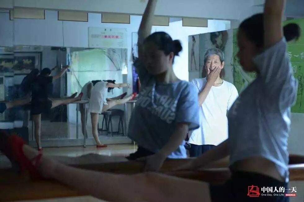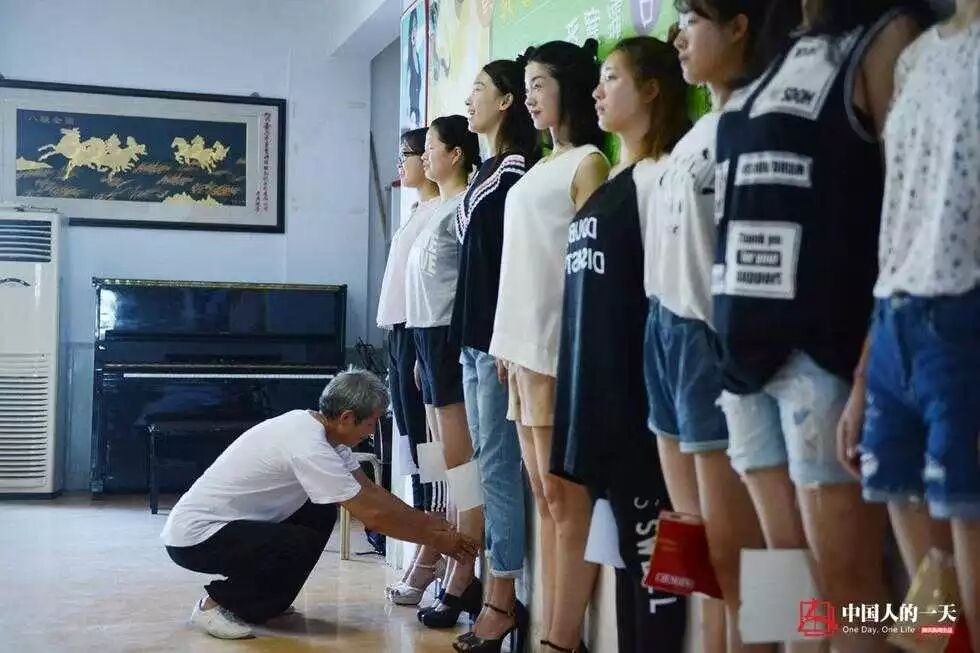 倩怡在模特班训练,潘世友监督女儿做出正确的训练姿势。