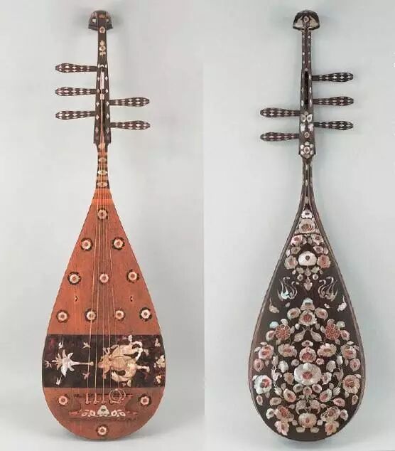 正仓院所藏唐代螺钿紫檀五弦琵琶,左右分别为正面和反面。