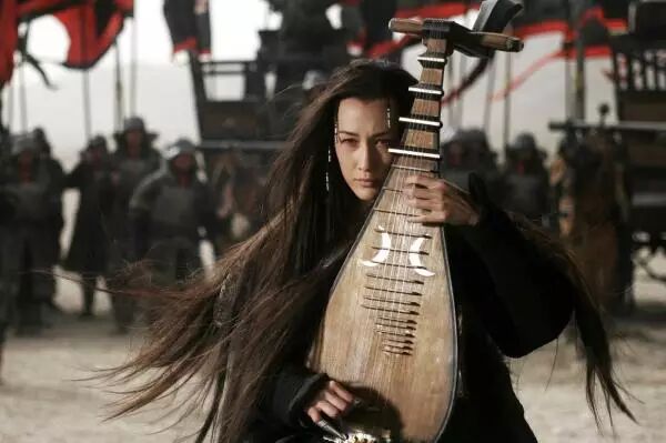 虽然是讲三国的,不过还是有许多架空的成分,比如Maggie Q饰演的曹婴本身就是个原创角色……于是乎手里的琵琶也不靠谱了起来。琵琶与战场倒是有确实联系,所谓“葡萄美酒夜光杯,欲饮琵琶马上催”,琵琶一开始和江南闺怨并不搭界,反而在边塞诗中屡屡得见。但早期琵琶为“四弦四柱”,没有品,绝不可能在下方面板上还出现那么多条条杠杠。早期琵琶的面板上原有两个月牙形的散音孔,李峤《琵琶》诗中形容为“半月分弦出”,但Maggie Q手中琵琶的月牙形更像是水冰月贴纸,不知如何起放大音量、调整音色的作用。至于右手戴着老佛爷的指甲套弹琵琶,我就什么也不说了。