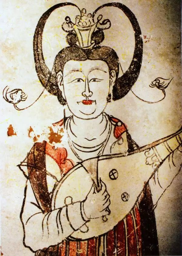 昭陵燕妃墓壁画(局部),唐代,出土于陕西礼泉县。壁画中女子手持琵琶,呈上斜抱姿势演奏。