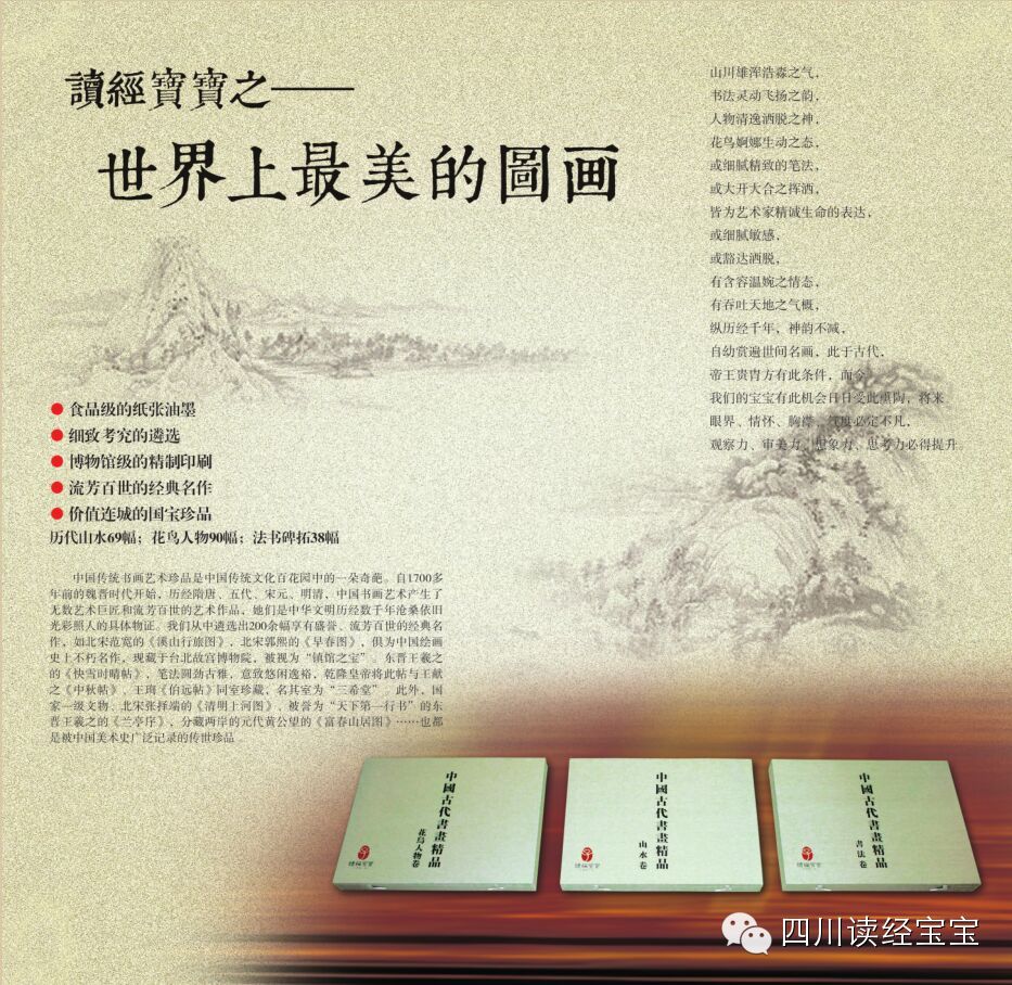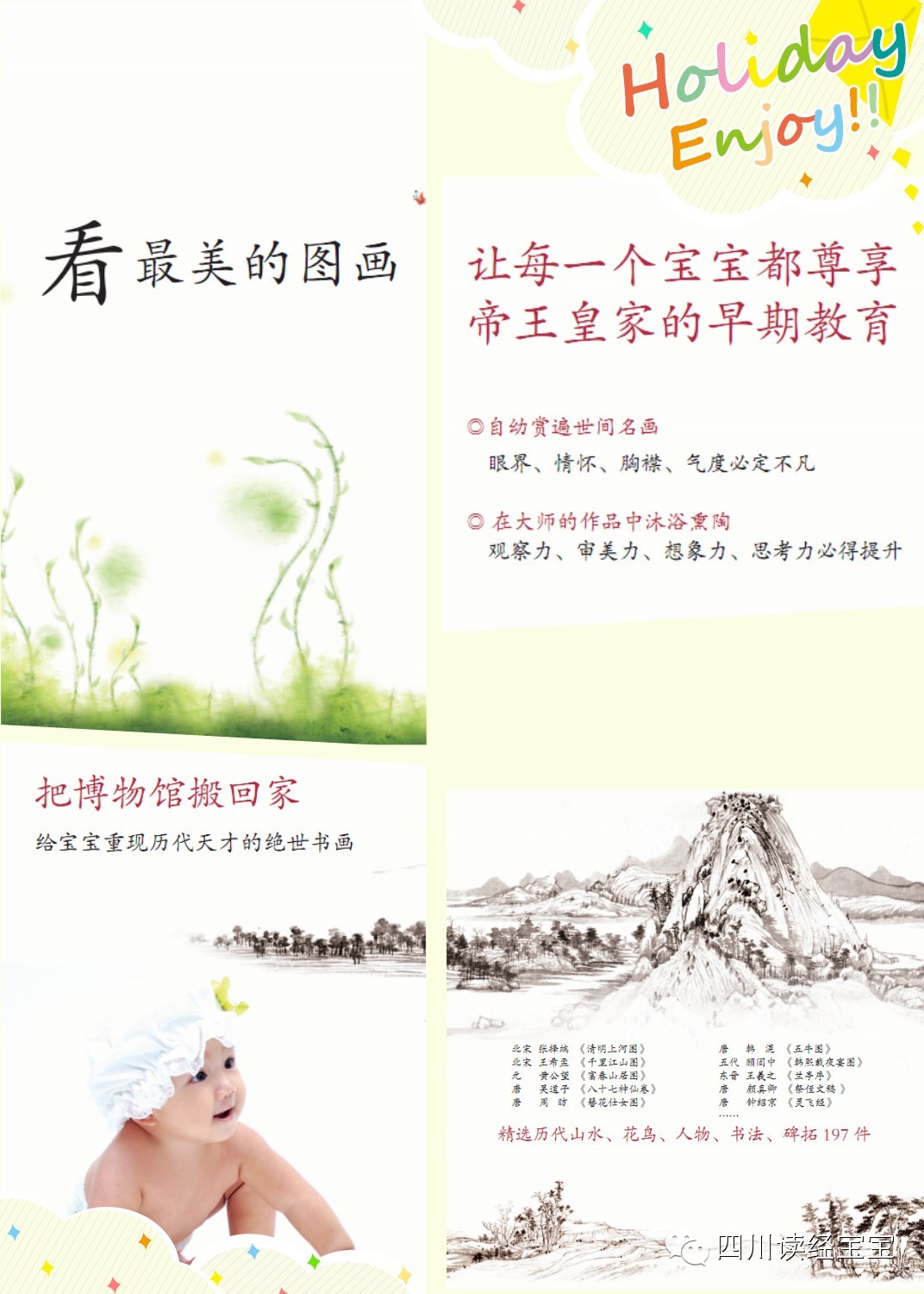 书画欣赏方法:每日可大量循环,只需念出作品名字;书法作品每日选取1张作为重点欣赏,指读多遍即可。