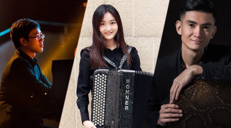 这三位分别是上海音乐学院民乐系御用钢琴伴奏:熊壮壮,多次国际手风琴大赛顶级奖项得主:尹异文,新加坡籍青年多才鼓手:李承颖。