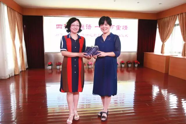 新仓镇向廊下镇赠送琵琶,镇党委委员俞惠锋上台接受赠送。