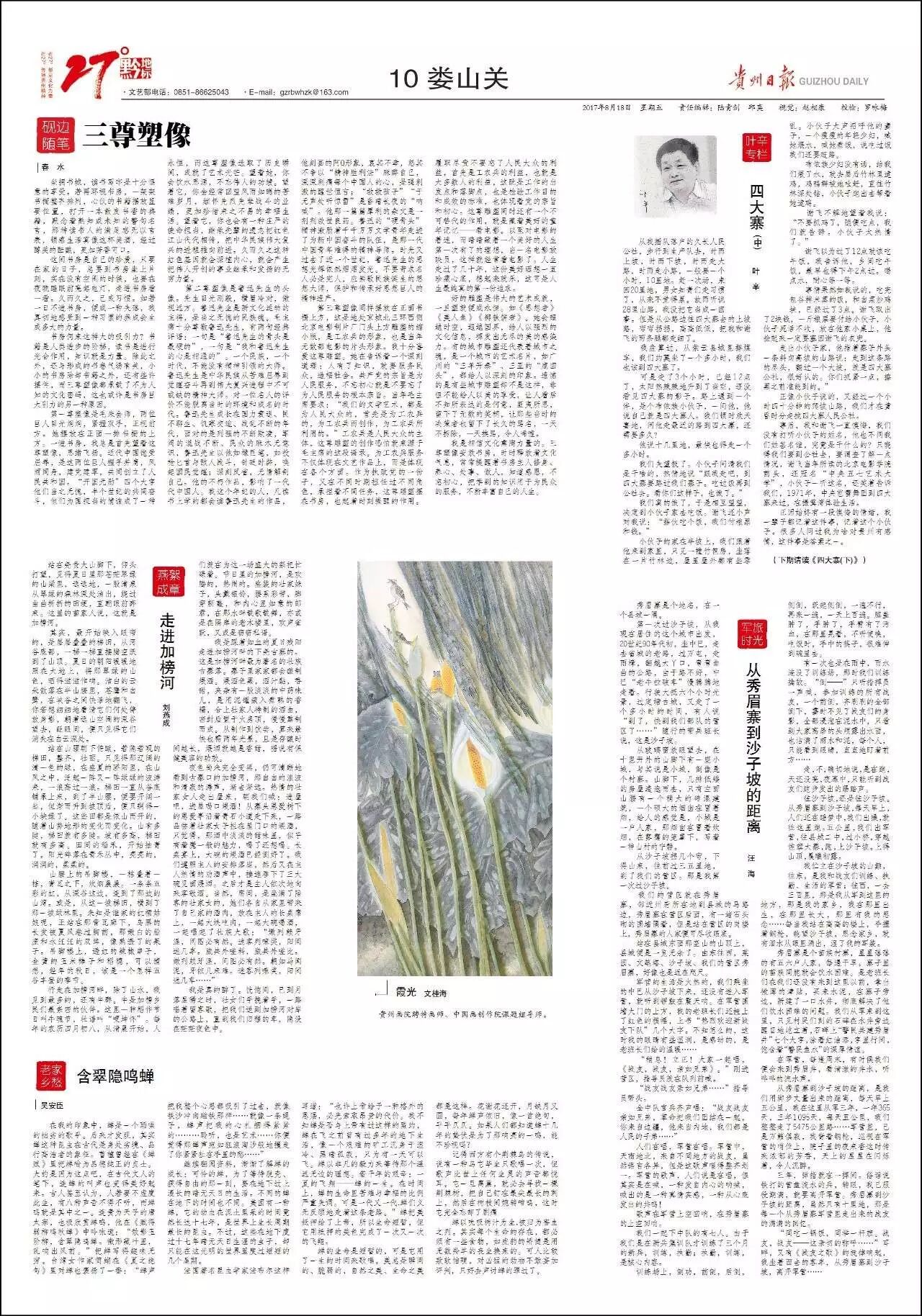 看点:此次他从《三尊雕像》说起,将“朱毛会师”雕像、鲁迅先生雕像和工农兵雕像联在一起表达,意在揭示“文化熏陶的力量”这个主题,读来令人深省。著名作家叶辛用朴素的语言,将人们带到紫云自治县的《四大寨》,偏僻的山乡、遥远的路程、艰难的岁月,往昔记忆聚涌而来。青年作家刘燕成用真诚的文字呼唤读者《走进加榜河》,让读者和他一起与壮族群众放声高歌。对军旅生涯有着深刻感受的汪海,将当年在军营里刻苦训练和学习的点滴,凝成《从秀眉寨到沙子坡的距离》这篇文章里,读来感觉旌旗猎猎。吴安臣在《含翠隐鸣蝉》里,详细记述蝉的特点,感叹“蝉的生命是短暂的,可是它用了一生的时间来唱歌”。