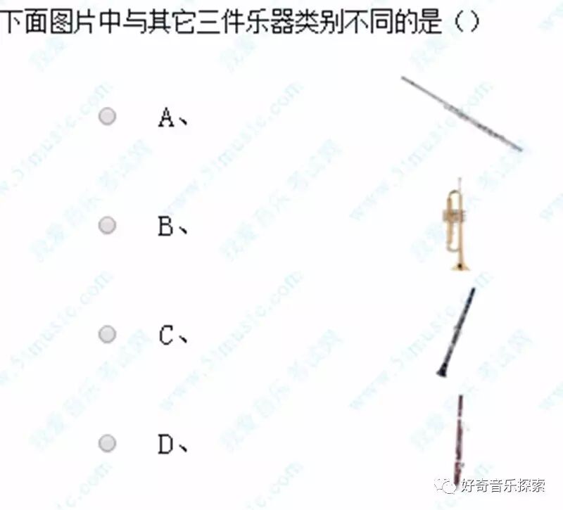 答案:B 小号, 因为小号属于铜管乐器,其他三种乐器属于木管乐器。