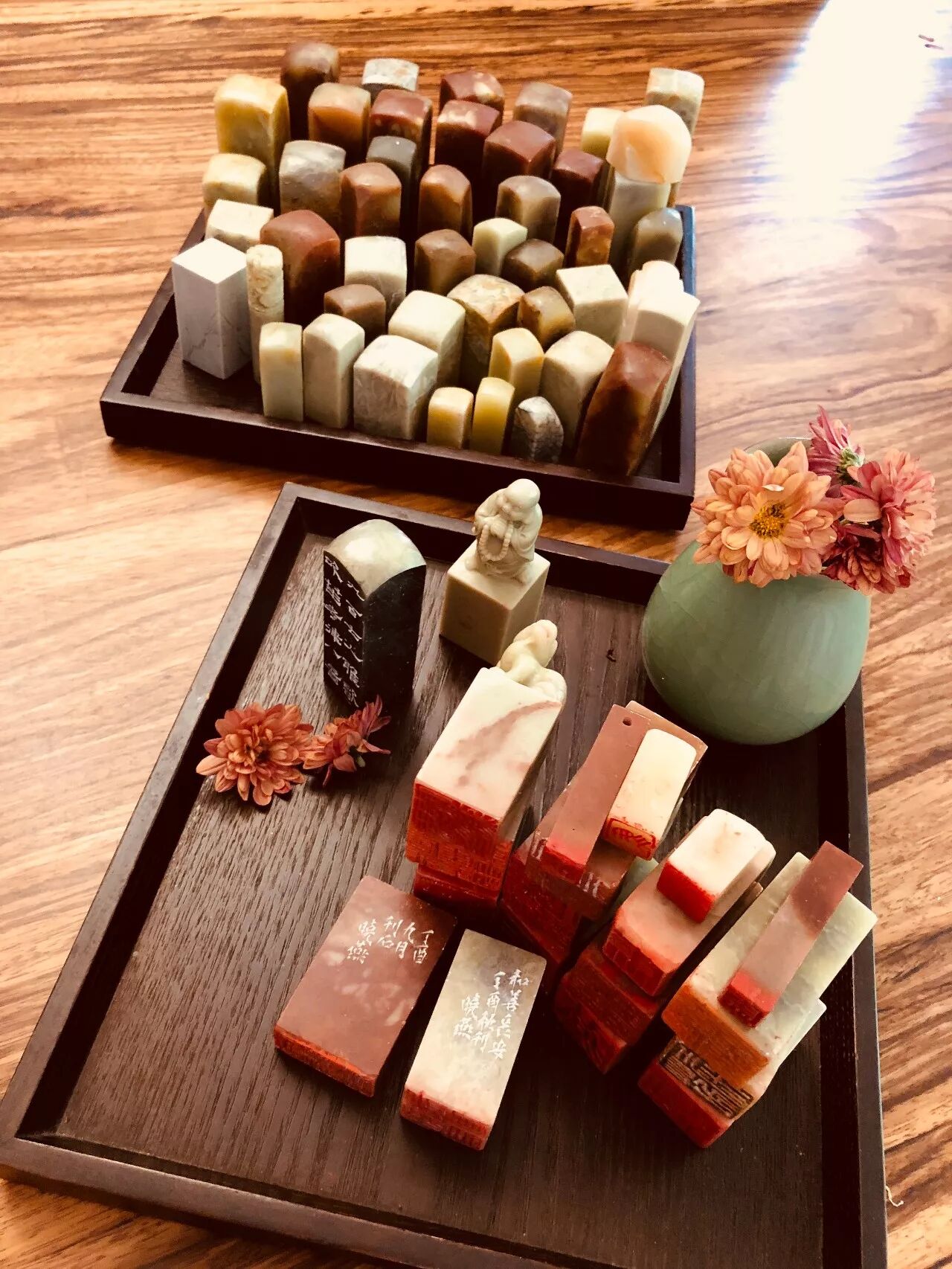 (图为基础班学员一学期造刻的印石以及为下一期进阶班准备的藏石