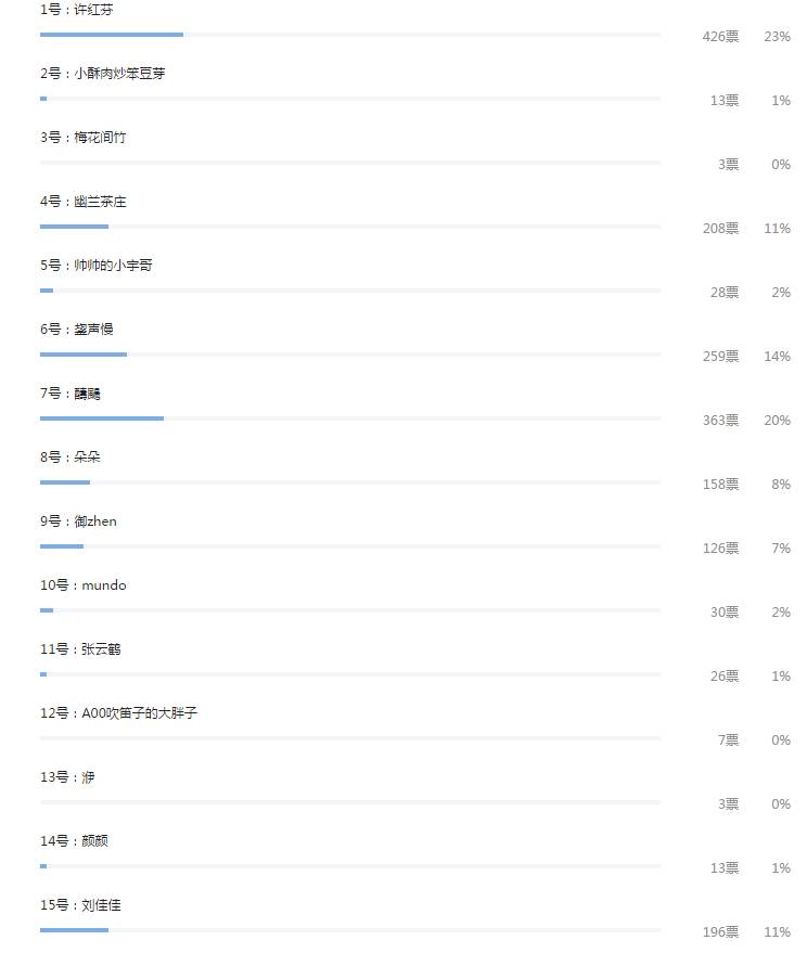 第一名:1号许红芬,426票。获【初见】【小笛子公仔】各一份