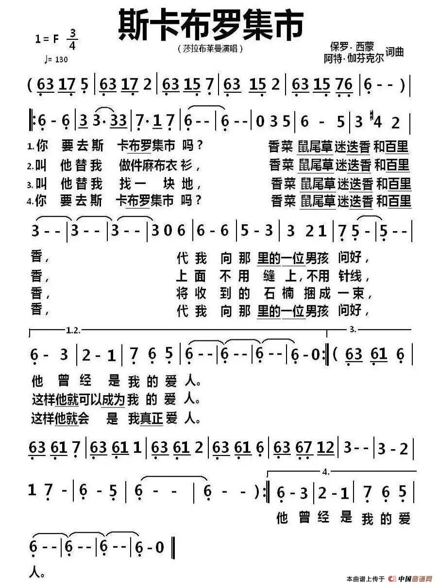 《斯卡布罗集市》原是一首古老的英国民歌,其起源可一直追溯到中世纪。后来,英国民歌歌手马丁·卡西在原歌的基础上尽进行了再创造,把它变成了一首爱情歌曲。