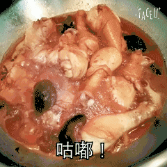 然后把大鸡腿放进锅里,沿着锅边倒入料酒,盖上锅盖等待上汽