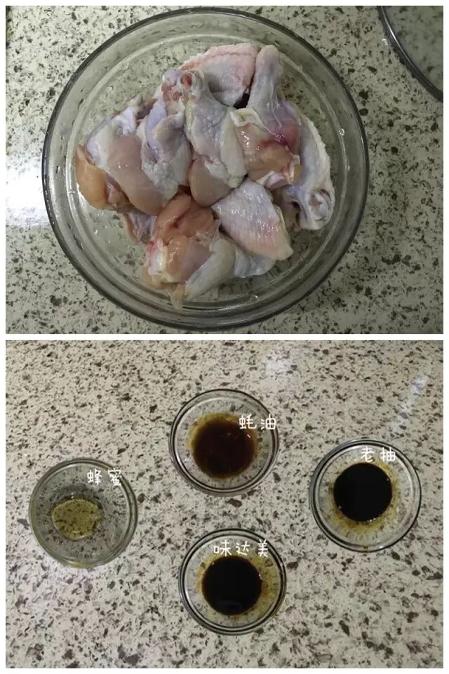准备食材:琵琶腿、翅中、味达美、蜂蜜、油、盐、老抽、蚝油;