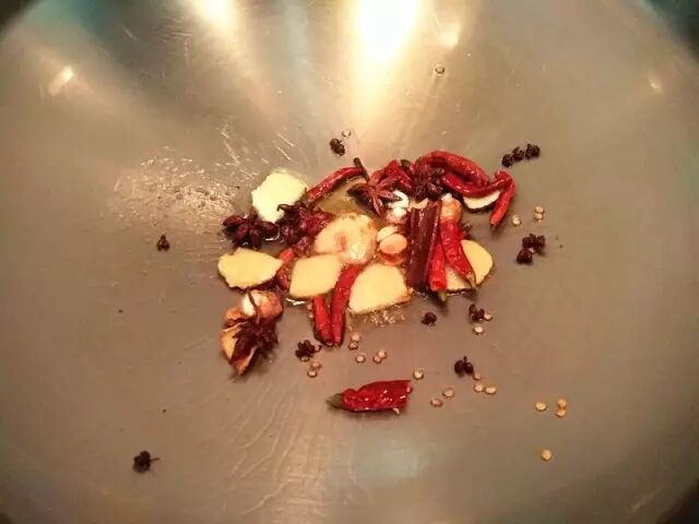 热锅凉油,油要少,把姜片、花椒、辣椒(要把干辣椒掰开再放)、八角、桂皮、白芷、山奈放进锅里爆出香味