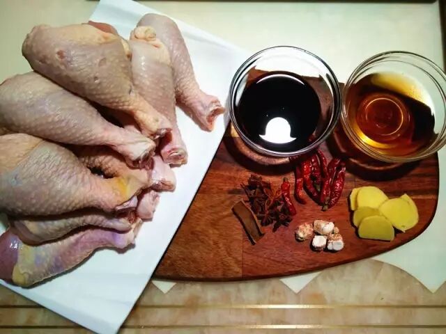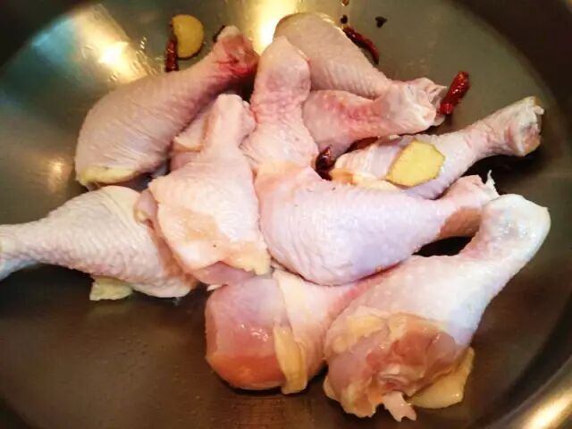食材:鸡腿、生抽、啤酒、料酒、姜片、干辣椒、干香菇、花椒、八角、桂皮、白芷、山奈