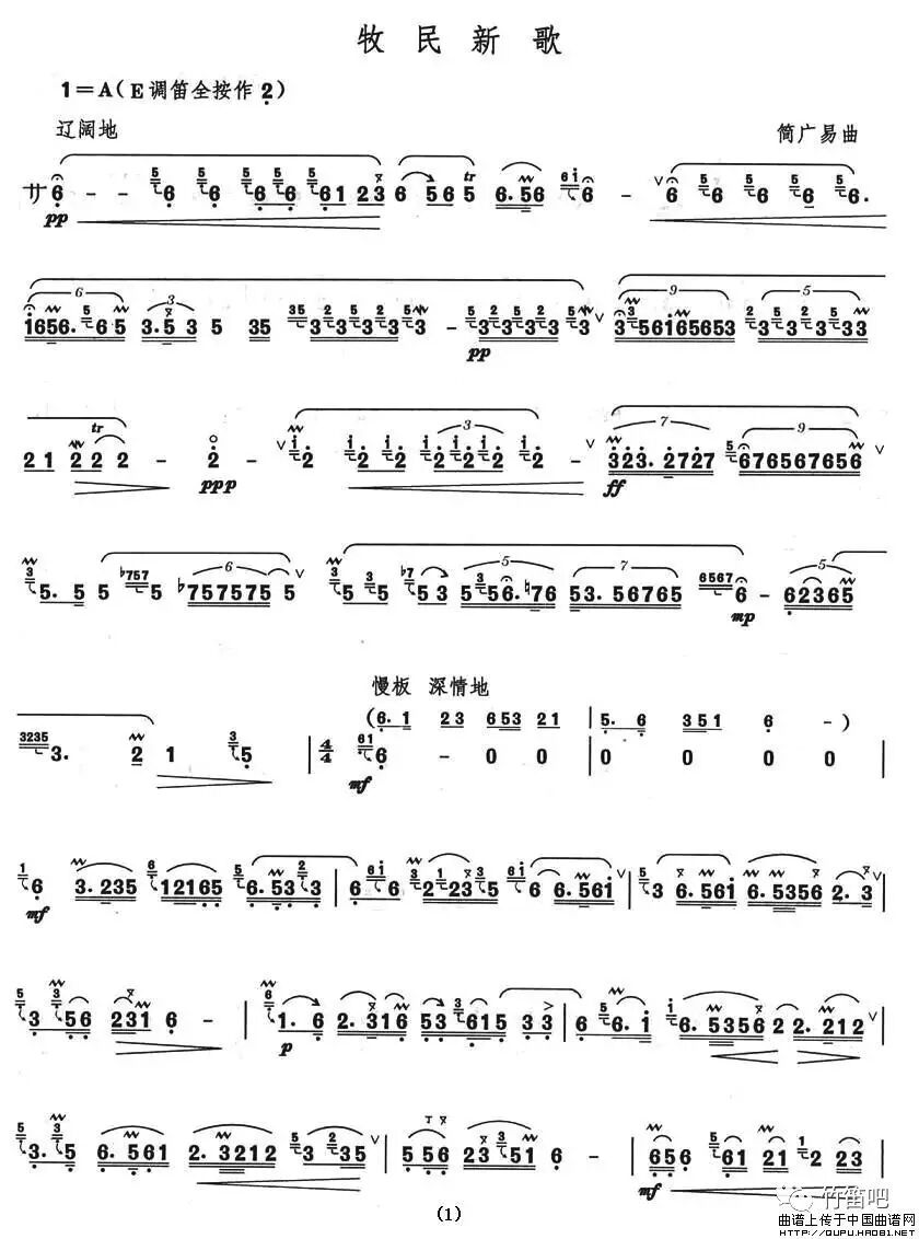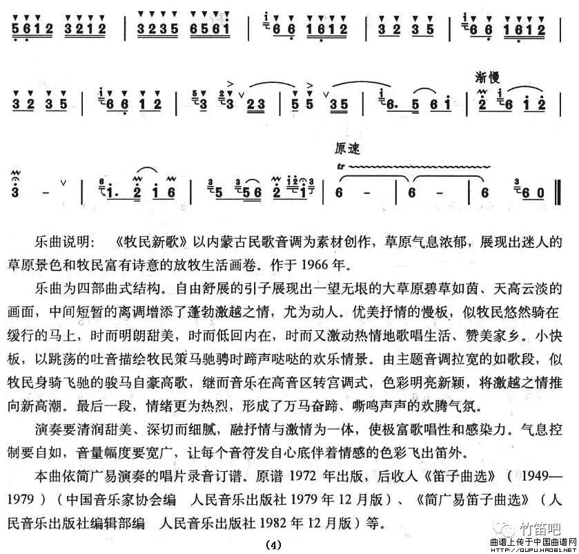 简广易版的《牧民新歌》吸收了多种演奏技巧,既有北方梆笛高亢明亮、灵活爽朗的风格,又兼有南方曲笛圆润含蓄、抒情柔美的特点,是笛子演奏史上的一大创新。它以其独具“雄而雌、强而弱、刚而柔、狂而雅、神而洁”的神韵风糜海内外,成为笛子曲的代表作。