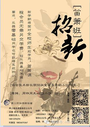 就算什么都还不会也没有关系!新学期,民族器乐协会笛箫班继续面对全校师生招收学员。笛箫课程无需另交学费,只需会员费30,对乐器基础不做要求,乐器零基础同学也可获得系统的训练,还有每周一次的集训帮助你!只要你对民乐有热情,能坚持,不要犹豫快来加入我们加入我们加入我们~