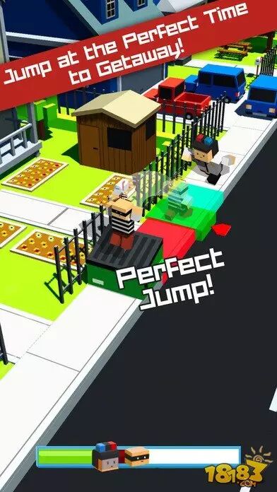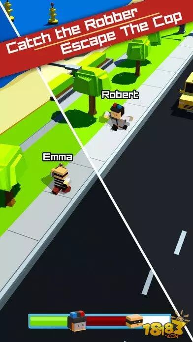 正式进入游戏后,系统会随机为玩家分配角色,强盗在前面跑,警察在后面追。游戏属于典型的追逐赛,有固定的距离,在规定距离之前小偷没有被抓住则算逃脱。操作方法也比较简单,场景中障碍物的前方会有一片区域由红、蓝、绿三种颜色组成,玩家只需在角色经过蓝色区域的时候点击屏幕就可以顺利通过该障碍物,只不过警匪双方的闯关方式有点不同,警察头很硬,所有障碍物都用头撞碎,而强盗腿脚灵敏,无论多高都能强行跨过。游戏整体的场景设置与音乐表现出了一定的水准,再加上玩法的轻松幽默以及单局游戏时长的偏短,总体来说很值得一玩