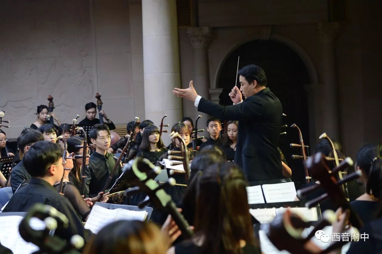 下半场是四首民族管弦乐作品,第一首是著名作曲家我校校友张晓峰创作的《狮城序曲》,这部作品的难度较大,也是少年民族管弦乐同学们首次接触复调创作手法的作品。接下来由西安音乐学院副院长韩兰魁教授创作的《祭海》给观众们留下深刻印象,《祭海》是出海远行前的重要仪式,音乐由面对大海的呼唤开始,表达了虔诚的祈望和真切的感悟。调性的自由移位体现了人们在出海前对故乡的无限眷恋,立体化的配器音响则追求对大海诗意描绘。通过对祭海仪式的刻画,表现人们对海上丝绸之路的美好愿景。朱琳创作的《舞之光影》乐曲结构紧凑,线条流畅而不失个性,节奏明快而富有动力,在不同声部的音色变换中,和谐统一与明暗对比交织成动态的光影图景,尤其在弹拨乐器语汇的运用上,突显了民族管弦乐队的特征与魅力。其中加入爵士风格,让整首曲子别有一番风味。最后一首作品是彭修文大师在八十年代根据琵琶曲改编的民族管弦乐《月儿高》,相传即为唐明皇时代的《霓裳羽衣曲》。此曲结构严谨,风格典雅,婉转动人的旋律中透露出宫廷音乐的气派。全曲采用起承转合的机构,描写了夜空中月亮从升起到落下的全过程。由乐队演奏此曲,较之琵琶曲的表现力更为丰富多姿,更符合唐代宫廷音乐的韵味。