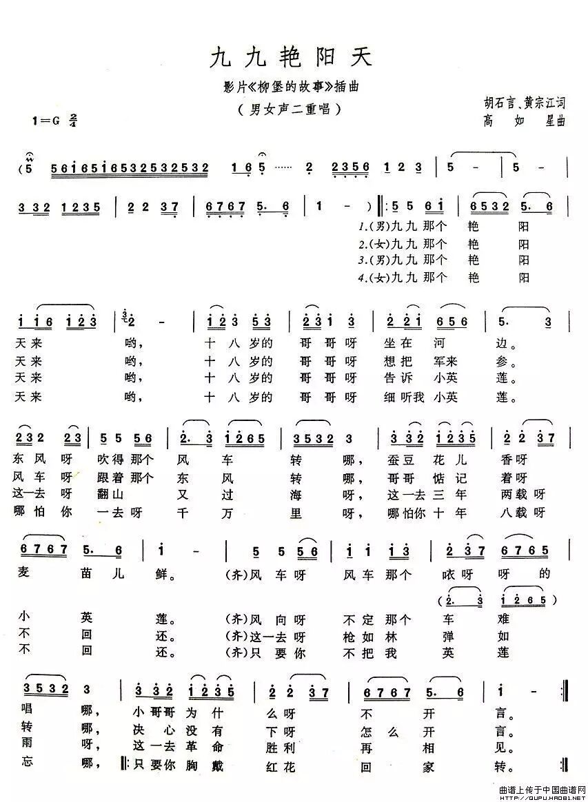 歌曲《九九艳阳天》,是1957年电影《柳堡的故事》的插曲。这首脍炙人口、流传广泛的电影歌曲在创作时,其歌词大量运用了民间的素材和民歌中赋比兴、问答和重复等表现手法,让整首歌曲充满活泼的生命力,有着坚实的生活基础。