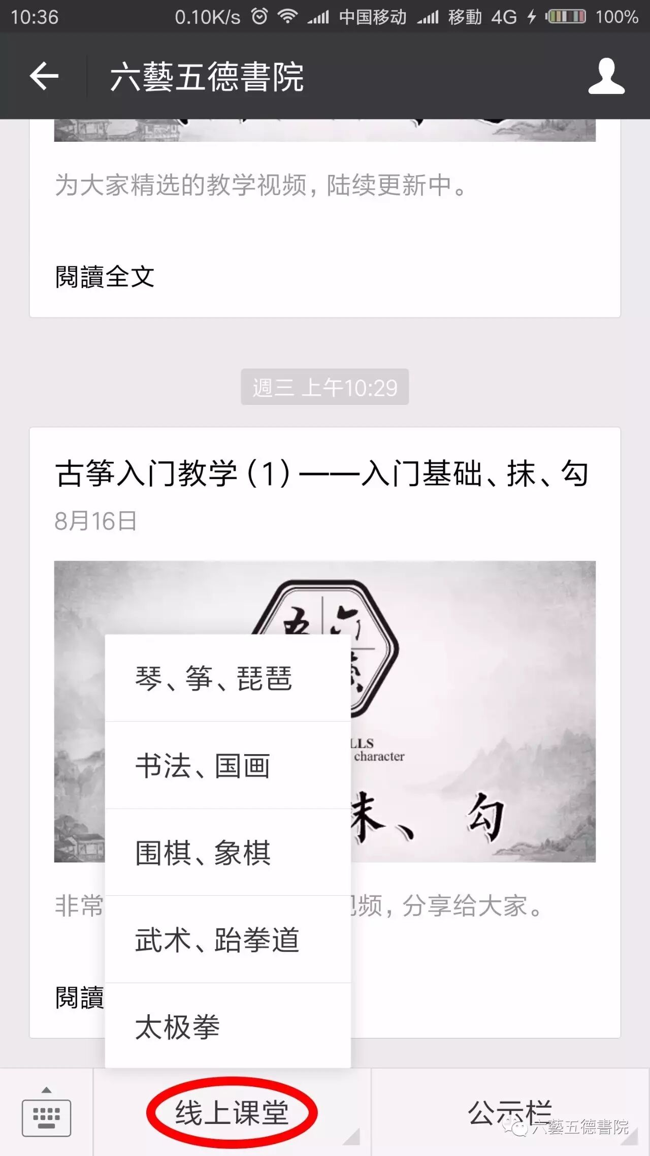 2.进入公众号,打开“线上课堂”菜单,点击您想要的线上教程
