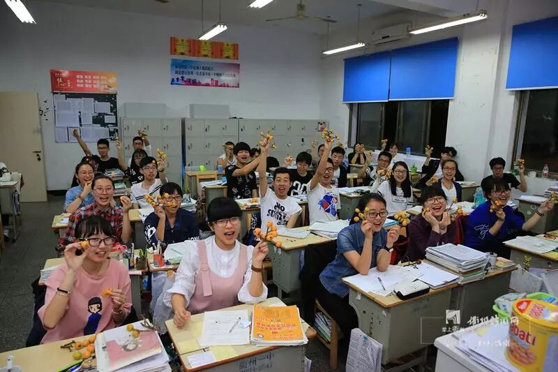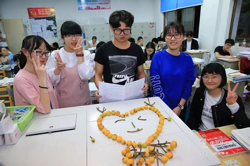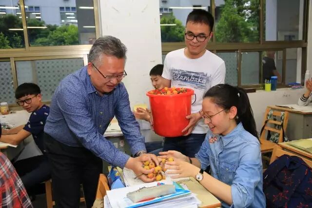 高三3班的教室里,校长徐衍昌边给同学们分发边说:“这是你们学弟学妹们下午刚摘的教学楼花园的枇杷,我们赶紧给你们送来了,一给大家解解馋;二给大家减减压,最后希望大家能像这金黄的枇杷一样也有一个锦绣的前程!”