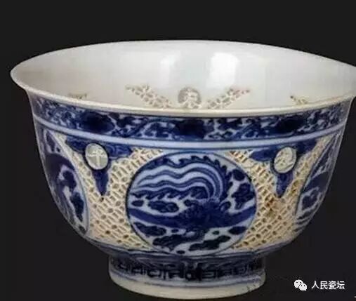 口径9.5cm;底径4cm;高5.6cm。撇口,弧壁,腹部饱满,造型精致小巧,碗身作钱币形镂空装饰,外壁五开光绘团凤纹。造型罕见,工艺复杂,是万历镂空装饰瓷器难得的精品。现收藏于观复博物馆。