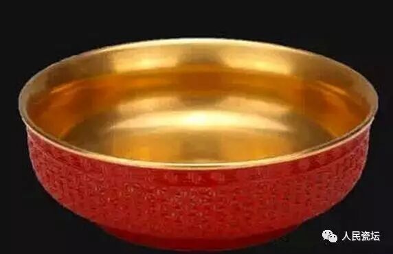 口径13cm;底径8.1cm;高4.6cm。墩式碗是源自于满族传统木质容器形制的一种碗式,清各代广有烧造。此碗弧壁,圈足,碗里满饰金彩,外壁施红釉,仿雕漆工艺,口沿剔刻一周回纹,腹部刻排列有序的锦纹,底红釉无款。现收藏于观复博物馆。